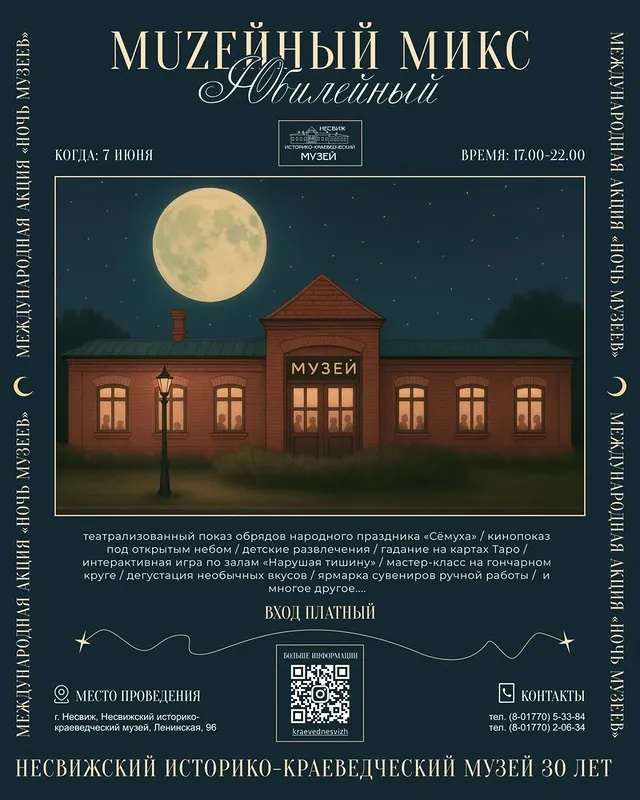 Приглашаем вас окунуться в атмосферу истории, традиций и современного искусства на нашем особенном событии — "Юбилейный Музейный Микс", который состоится 7 июня с 17:00 до 22:00 в Несвижском историко-краеведческом музее!